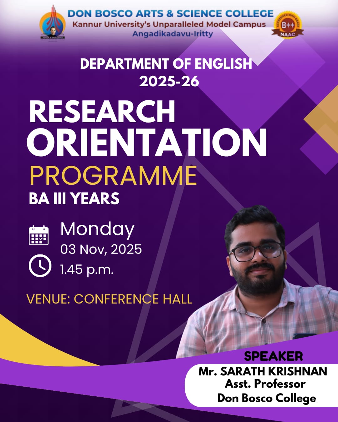 Department of English is organising a Research Orientation Programme on 03-11-2025. Mr. Sarath Krishnan, Asst. Prof, Department of English, will lead the programme.