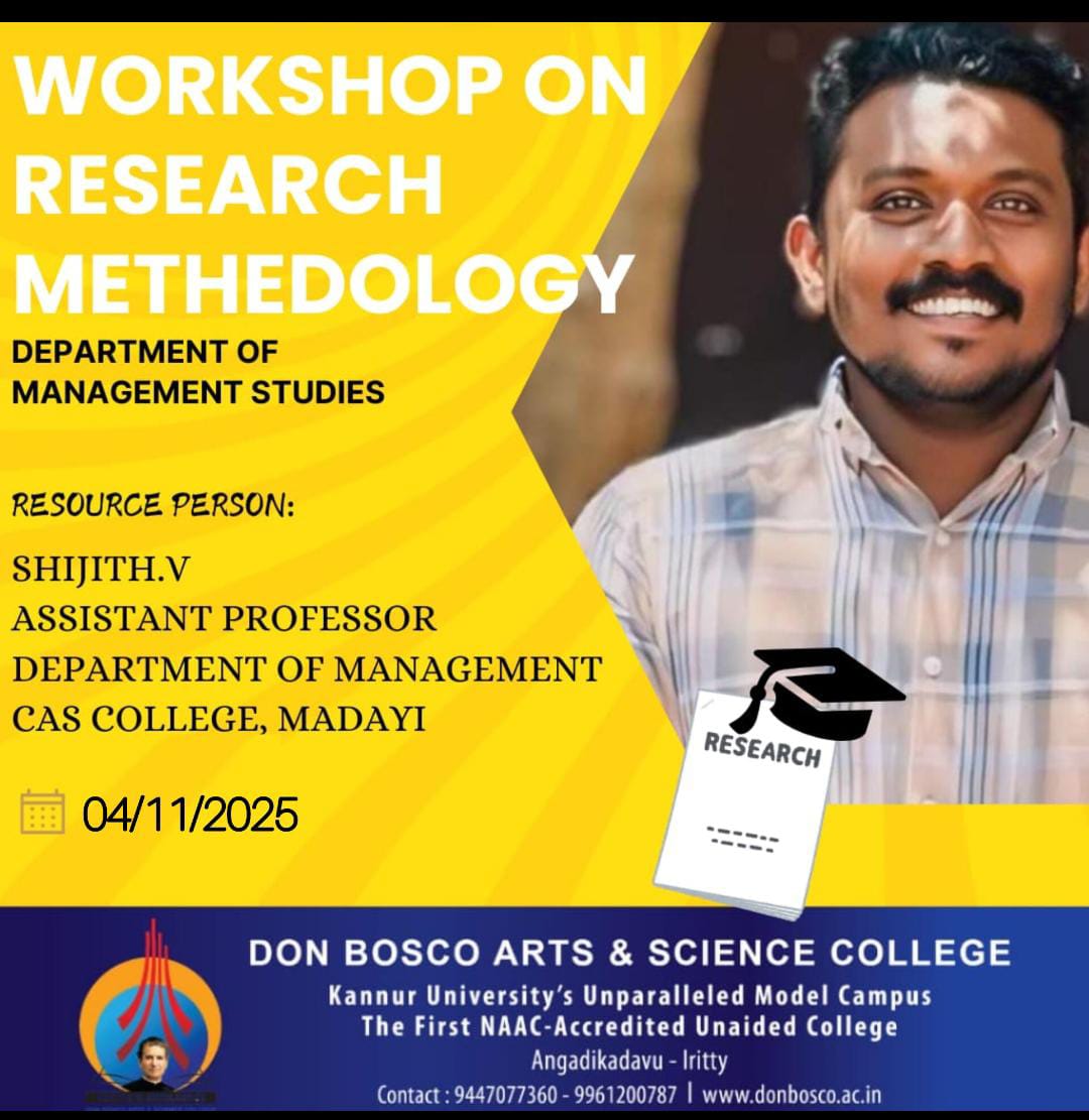 Department of Management is organising a workshop on Research Methodology on 04-11-2025. Mr. Shijith V, Asst. Professor, Department of Management, CAS College Madai will be leading the workshop.
