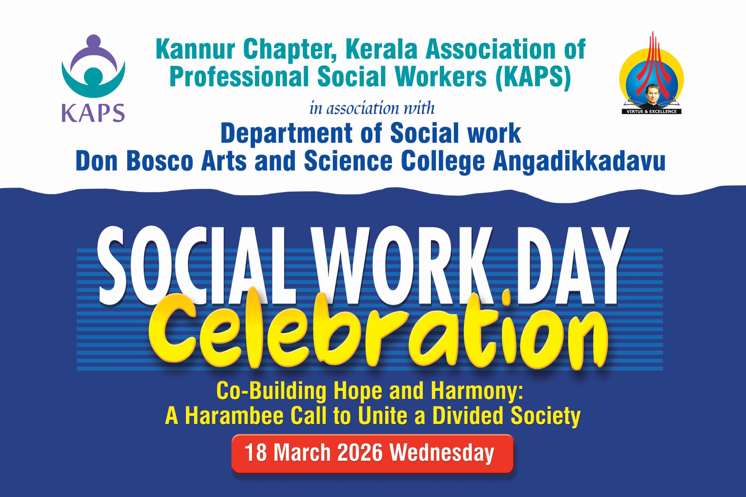 Social Work Department, Don Bosco College in association with Kearala Association of Professional Social Workers, Kannur Chapter will Celebratellege Social Work Day on 18 March 2026.