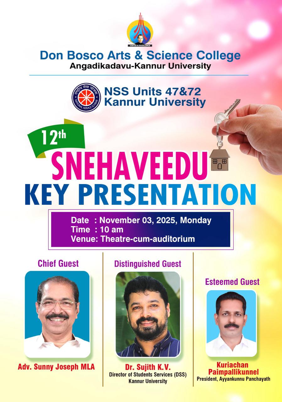 The Key Presentation Ceremony of the 12th Snehaveedu constructed by NSS Units 47 & 72 of Don Bosco Arts & Science College will be on 03-11-2025. Adv. Sunny Joseph MLA will be chief Guest during the function. Dr. Sijith K.V., Director of Student Services and Mr. Kuriachan Paimpallikunnel, President, Ayyankunnu Gram Panchayat also will be available for the Ceremony.